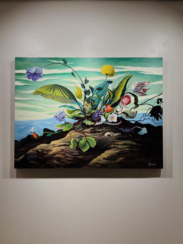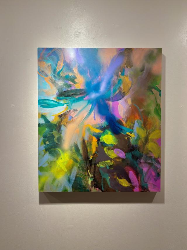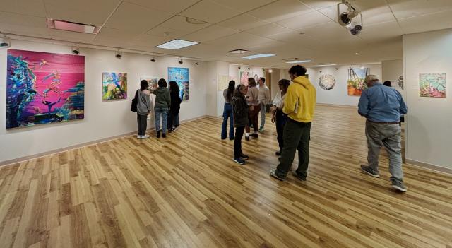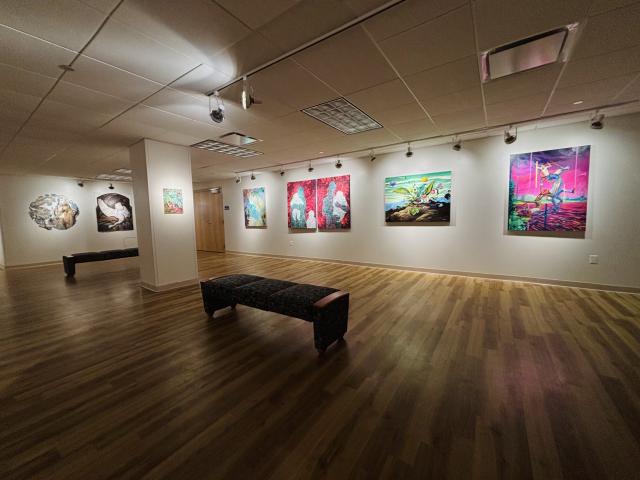Something Extraordinary Art Exhibit February 2023 featuring colorful art work on the walls and floor of the Arnos Maris Art Gallery.