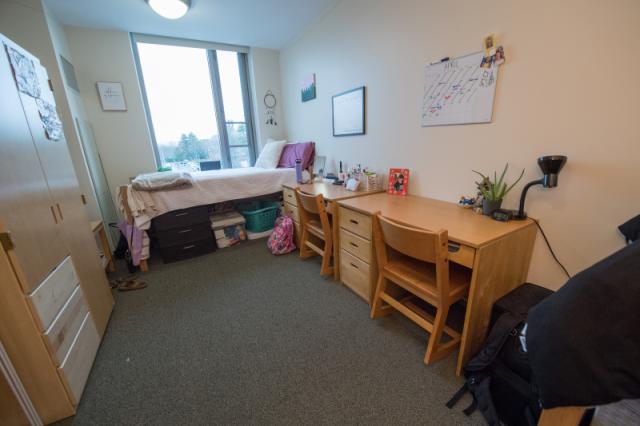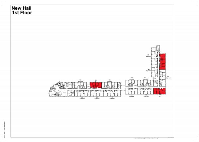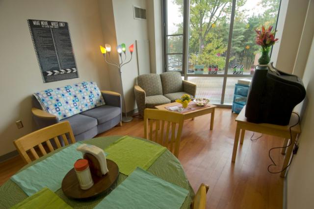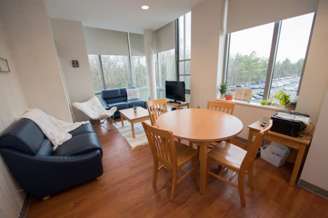 New Hall is made up of 4- and 6-person apartments. Full kitchens, private bathrooms (one in 4-person units, two in 6-person units), and large bay windows in the living room areas are among the amenities.