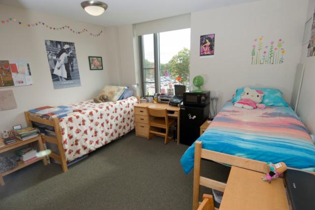 Common areas include a main lounge equipped with a plasma television; a multi-purpose room suitable for a variety of academic and social uses; floor television lounges and study rooms; two elevators for student use; and a recreation room.